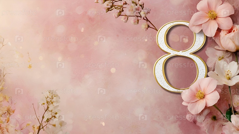 Международный женский день. Праздник приходится на 8 марта. Баннер, флаер. Праздничный, нежный розовый цветочный фон с номером 8
