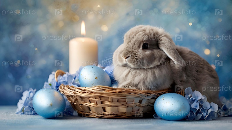 Концепция яркого пасхального праздника. Нежные пасхальные яйца, серый кролик и голубые цветы гортензии на пастельном акварельном фоне с нежными венами