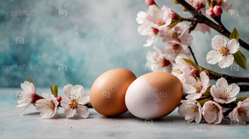 Концепция яркого пасхального праздника. Нежные пасхальные яйца и вишневые ветви цветут на пастельном акварельном фоне с нежными прожилками