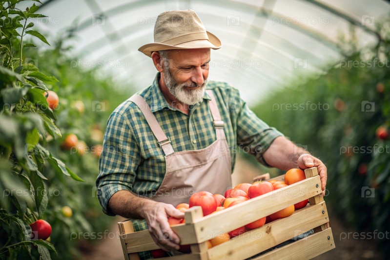 Сельскохозяйственная промышленность. Деревянный ящик с помидорами в руках мужчины-фермера. Садовник собирает богатый урожай в теплице