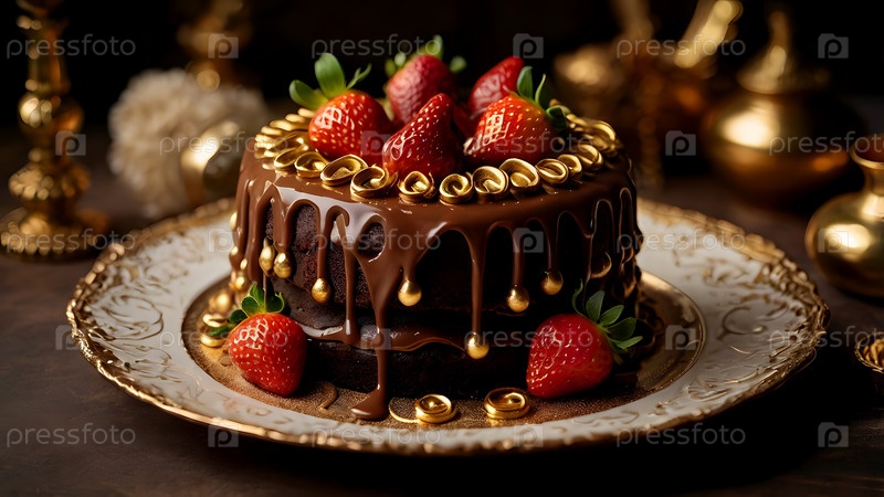Концепция праздничных блюд. Пекарня. Красивый вкусный торт со свежей клубникой и шоколадом на столе. День рождения и сладости