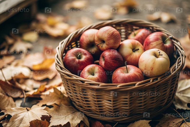 Плетеная корзина, полная свежих фруктов. Корзина с красными яблоками. Прекрасный солнечный свет. Осенний урожай, уборка или уборка урожая