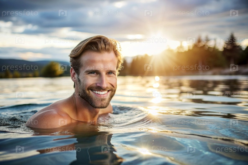 Красивый молодой человек плавает и тренируется в отапливаемом бассейне, счастливая и улыбчивая девушка. Рекреационные водные виды спорта