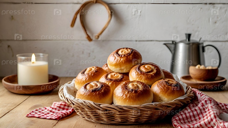 Домашняя свежая выпечка на кухонном столе. Свежие вкусные булочки в пекарне. Свежеиспеченная выпечка из муки