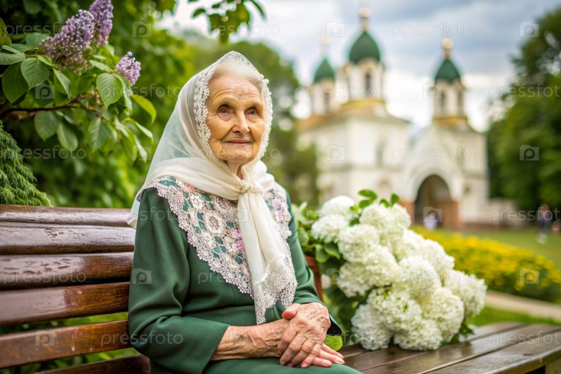 Православная Россия. Пожилая бабушка в платке сидит на скамейке рядом с цветущим деревом перед православной церковью