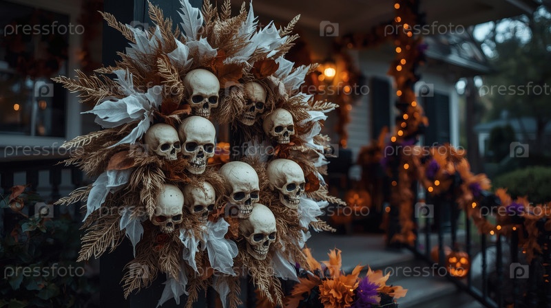 Дом, украшенный на Хэллоуин или День мертвых. Страшный Хэллоуин венок из тыкв, черепов, белых и золотых осенних листьев и перьев