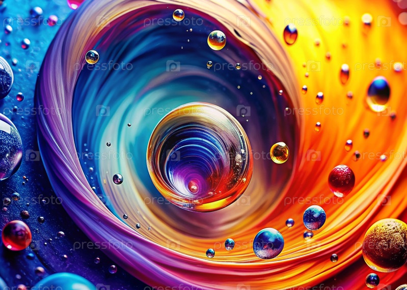 Абстрактный фон. Яркий красочный водоворот разноцветных красок, брызг, брызг. Пузыри и капли воды