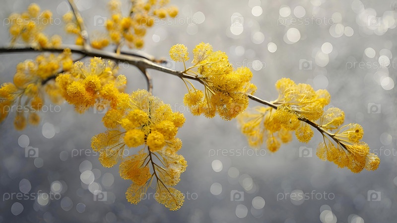 Красивый пушистый букет мимозы на сером фоне. Близко. Идея весны и Международный женский день 8 марта