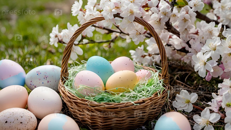 Концепция яркого пасхального праздника. Красивый фон с пасхальными яйцами в плетеной корзине и весенними цветами вишни