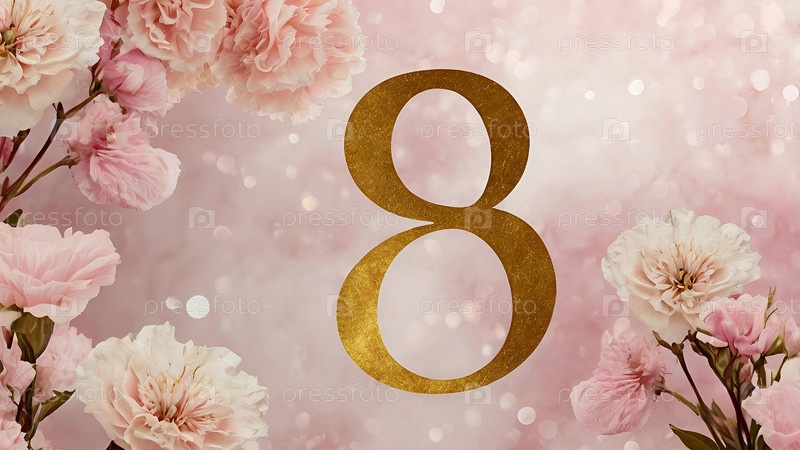 Международный женский день. Праздник приходится на 8 марта. Баннер, флаер. Праздничный, нежный розовый цветочный фон с номером 8