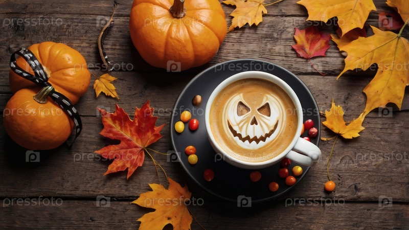 Праздники Хэллоуина. Тыква, осенние листья и чашечка кофе Хэллоуина на столе. Вид сверху, деревянная поверхность
