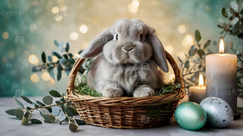 Концепция яркого пасхального праздника. Нежные пасхальные яйца, серый кролик и зеленые ветви эвкалипта на пастельном акварельном фоне с нежными венами