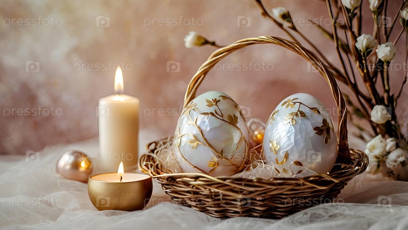 Концепция яркого пасхального праздника. Нежные пасхальные яйца в жемчужной корзине и нежные цветы на пастельно-водяном фоне