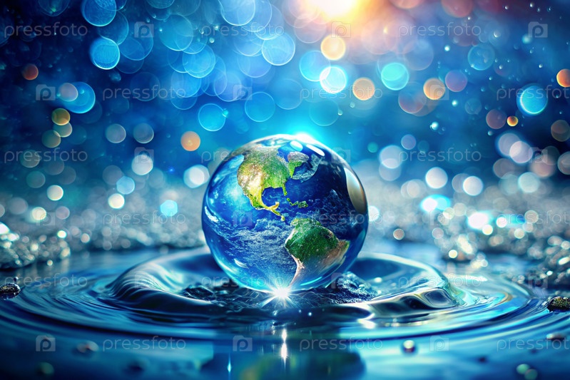 Концепция праздника — Всемирный день воды и День Земли. Планета Земля находится в чистой воде с каплями и брызгами. Красивый боке