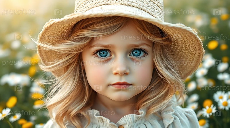 Всероссийский день семьи, любви, верности. Красивая маленькая кудрявая девочка в соломенной шляпе на фоне поля ромашек. День Святого Валентина Петра и Февронии