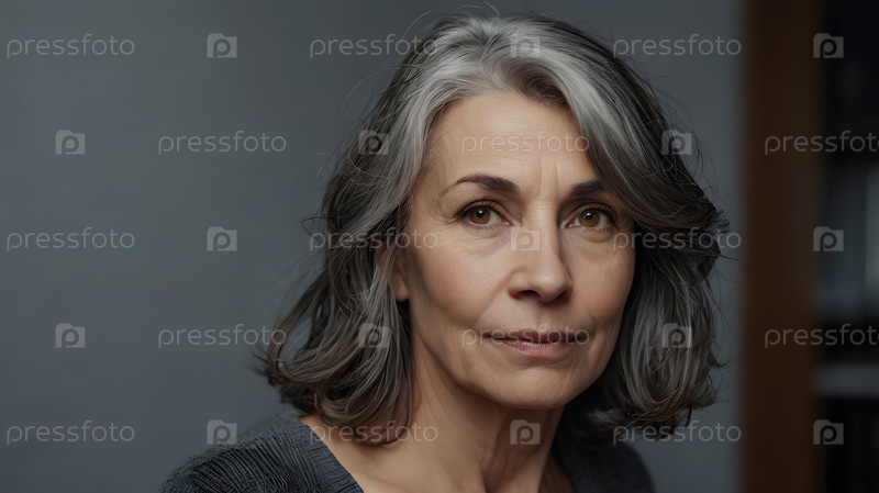 Минимализм. Студийный портрет естественно стареющей элегантной седой пожилой женщины в интерьере и одежде спокойных тонов. Концепция пожилых людей