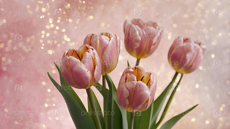Тюльпаны — весенние цветы. Красивый цветочный фон с красивым эффектом боке. Тюльпановые почки на розовом акварельном фоне с золотыми жилками