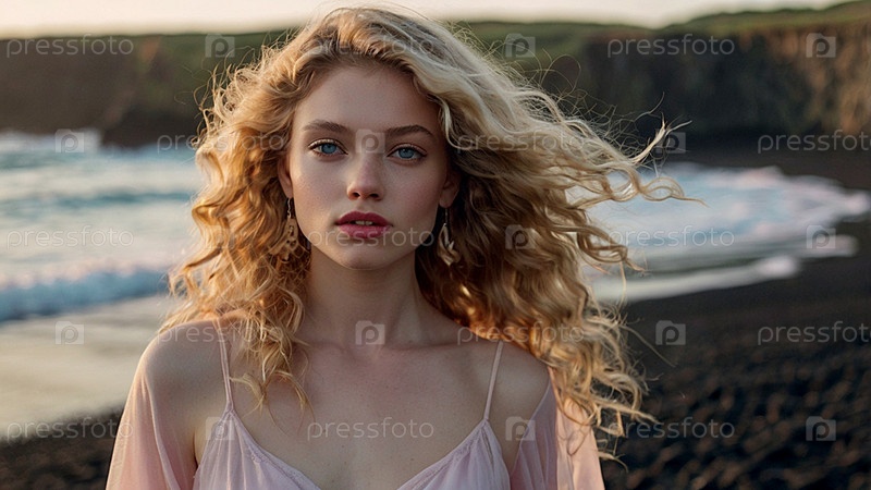 Портрет красивой женщины на пляже на фоне моря. Романтическая, спокойная и чувственная фотография девушки в воздушном нежном платье