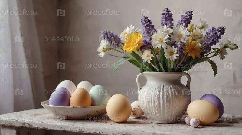 Концепция яркого пасхального праздника. Ретро интерьер дома с пасхальным декором. Весенние цветы в белой вазе и пасхальные яйца в пастельных оттенках