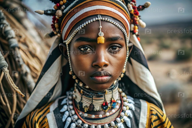 Красивая африканская девушка в традиционном африканском национальном костюме. На фоне костей. Портрет символизирует традиции, культуру и красоту африканского народа