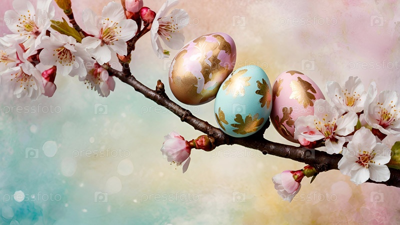 Концепция яркого пасхального праздника. Нежные пасхальные яйца и вишневые ветви цветут на пастельном акварельном фоне с нежными прожилками