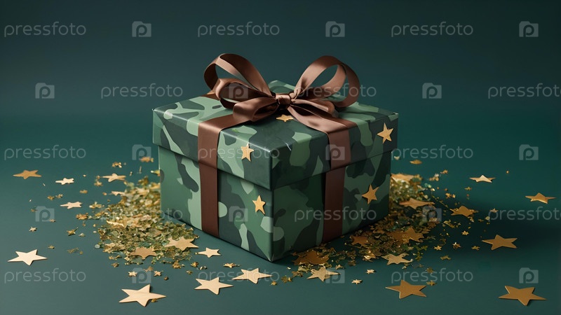 Концепция Дня защитника Отечества 23 февраля. Подарок камуфляжной коробки с праздничным атласным ленточным луком на темно-зеленом фоне
