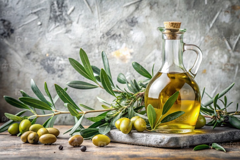 Оливковое масло в красивой бутылке со свежими оливками и цветущими оливковыми ветвями на светлом фоне