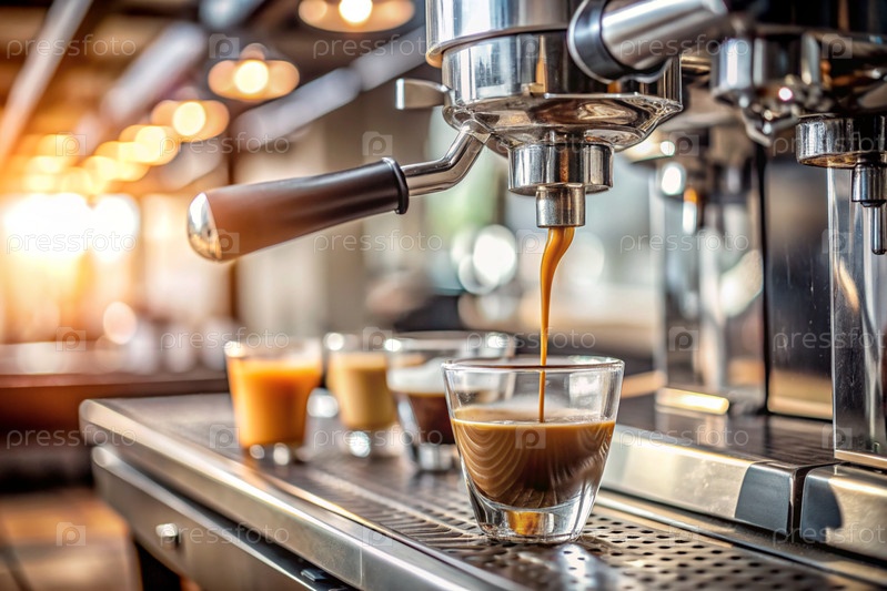 Свежесваренный кофе, выливающийся из кофемашины на размытом фоне кофейни или ресторана. Место для текста