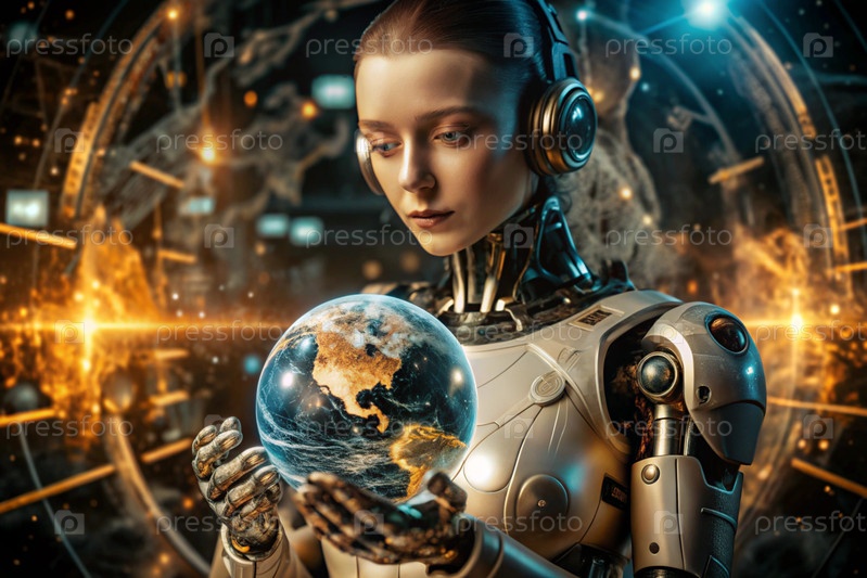 Женщина-киборг с моделью планеты в руках. Интеграция технологий и человеческого взаимодействия. Роботизированное производство. Искусственный интеллект, Интернет и будущие цифровые технологии