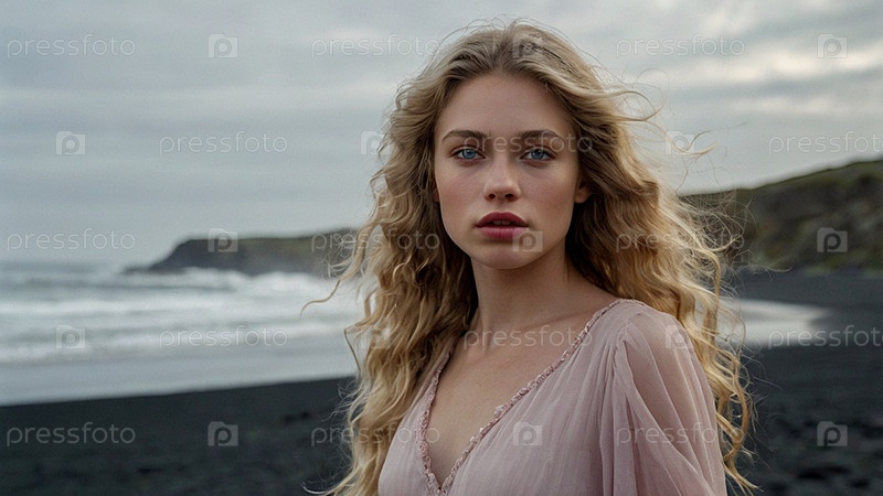 Портрет красивой женщины на пляже на фоне моря. Романтическая, спокойная и чувственная фотография девушки в воздушном нежном платье