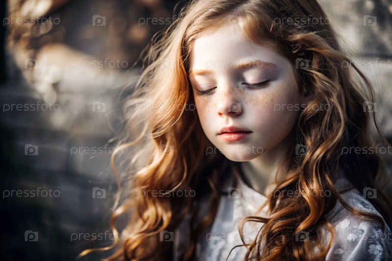 Портрет красивой маленькой рыжеволосой девушки с длинными волнистыми волосами и задумчивым взглядом. Волосы развиваются и создают ощущение легкости и естественности