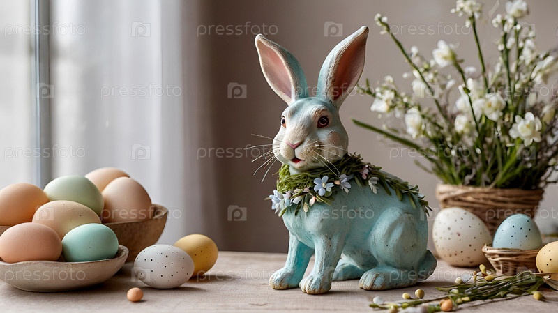 Концепция яркого пасхального праздника. Нежные пасхальные яйца и пасхальный кролик