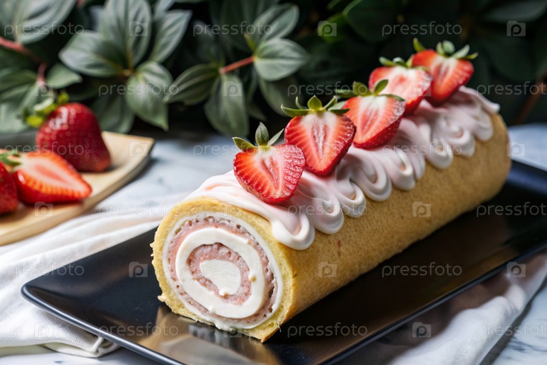 Швейцарская губка с клубникой, вкусный фруктовый и сливочный десерт, наполненный сливочным сыром, украшенный свежей клубникой