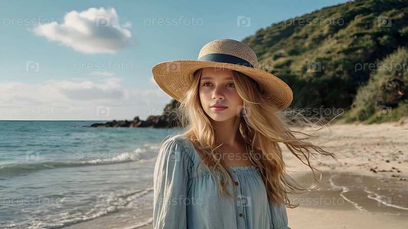 Летний отдых на пляже, крупный план красивой женщины в соломенной шляпе. Летнее время. Отдых и каникулы, место для копирования