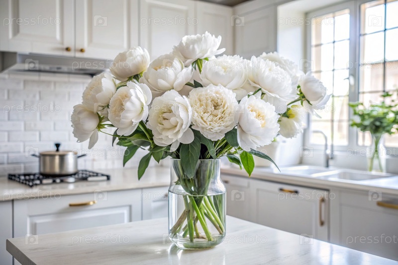 Красивый белый букет пионов на золотом подносе на столе. На заднем плане находится интерьер современной белой кухни в скандинавском стиле. Концепция домашнего комфорта