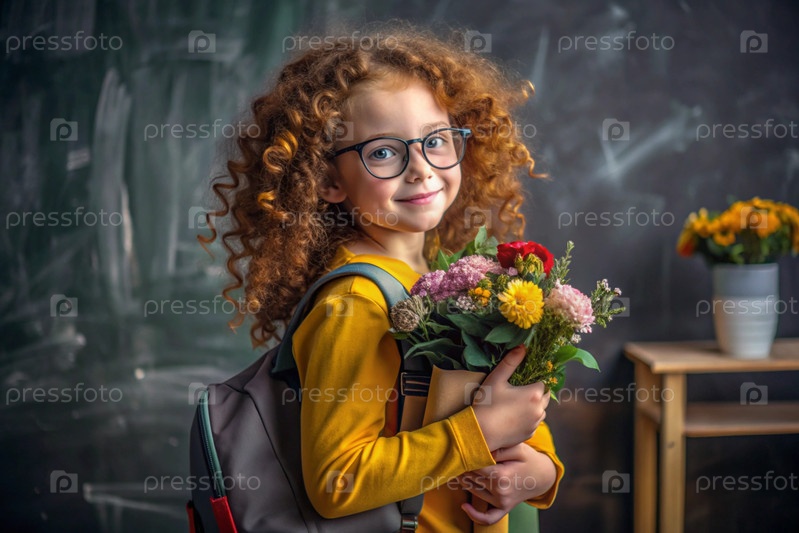 Рыжеволосая скандинавская девушка в очках у доски. У девушки в руках цветы. Она впервые идет в школу. Ребенок с рюкзаком, книгой и цветами. Вернемся в школу