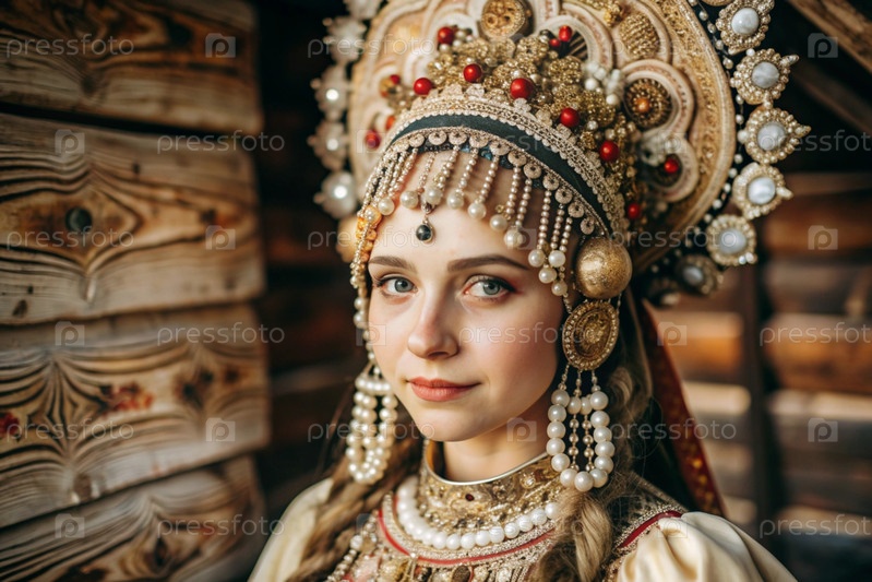 Красивая девушка в традиционном русском национальном костюме. Портрет символизирует традиции России и красоту русского народа
