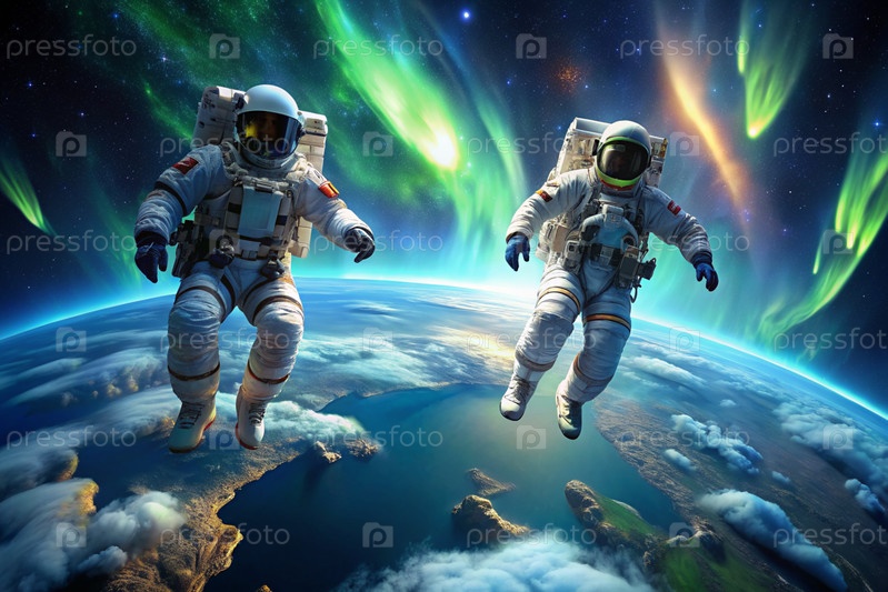 С Днем космонавтики. Астронавты в скафандре в космическом пространстве. Захватывающий вид на планету Земля и северное сияние