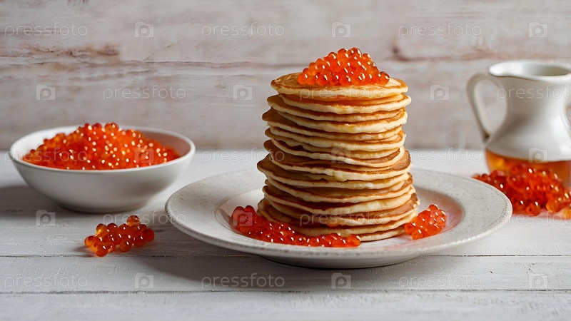 Русские традиции. Российский праздник Масленица. Натюрморт с кучей блинов и красной икры на светлом бежевом фоне