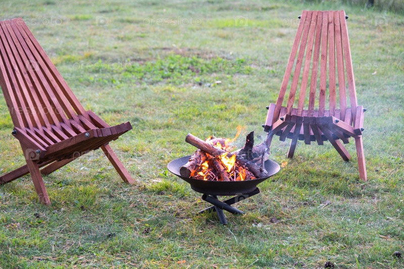 Металлическая огненная чаша с горящей древесиной во дворе и садовая стойка палубных кресел. Безопасная декоративная огненная яма, Пикник в саду