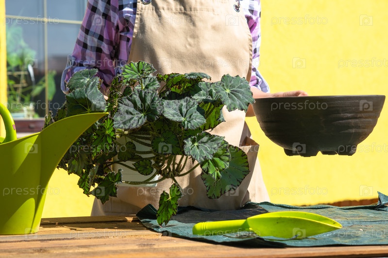 Женщина-флористка в фартуке пересаживает наружный завод begonia для озеленения в наружных плантаторах