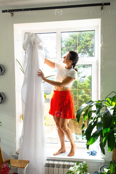 Женщина вешает прозрачные тюльские шторы на большие окна в доме внутри интерьера с горшечными растениями. Весенняя уборка, уборка