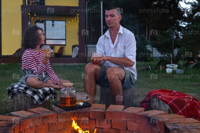 Семья мамы, папы, дочери пьют чай во дворе дома у пожарной ямы уютным летним вечером