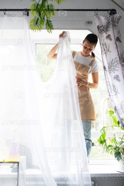 Женщина в фартуке вешает прозрачные тюльские шторы на большие чердачные окна в доме внутри интерьера с горшечными растениями. Весенняя уборка, уборка