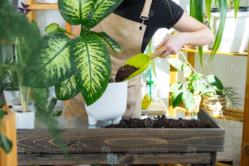 Пересадка и уход за домашним растением dieffenbachia seguine Tropic Snow в новый горшок домашнего интерьера. Женщина разводит и выращивает растения хобби, держит вариетальную диффенбахию с большими пятнистыми листьями, больших размеров