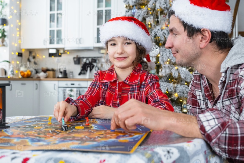 Счастливая семья папы и дочери в праздничных шляпах Санта играет в настольную игру за столом на белой кухне с елкой и декором. Новый год, семейные ценности