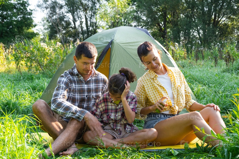 Семья использует отталкивающий открытый кемпинг и пикник возле палатки