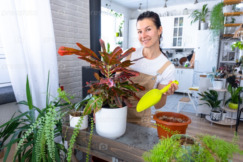 Пересадка и уход за домашним растением кодиевого кротона в новый горшок в домашнем интерьере. Женщина разводит и выращивает растения хобби, держит тропическое растение с красными листьями