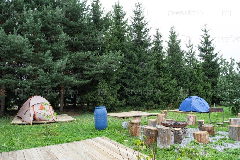 Установлена туристическая палатка в кемпинге на природе в лесу. Внутренний туризм, активные летние каникулы, семейные приключения. Экотуризм, спорт, поход. Копировать пространство, высмеивать
