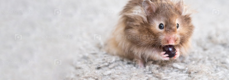 Забавный пушистый сирийский хомяк ест и удивляется, набивает себе щеки. Питание для грызунов, витамины. Закрытие, копирование пространства